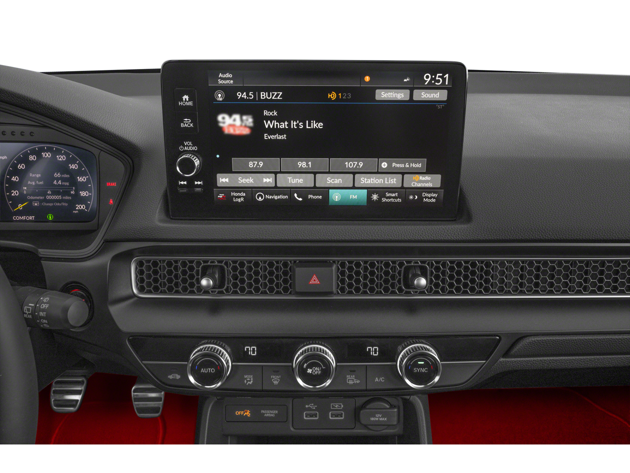 - Radio: Bose Premium Sound System w/SiriusXM -inc: 12 speakers w/subwoofer, 9" color touch-screen w/volume knob, customizable feature settings and smart shortcuts, Honda Satellite-Linked Navigation System w/voice recognition and Honda Real-Time Traffic, HondaLink, wireless Apple CarPlay/Android Auto compatibility, HD Radio, 2.5-amp USB charging port in front console, 2.5-amp USB smartphone/audio interface port in front console, Bluetooth® HandsFreeLink and streaming audio, SMS text message function, Radio Data System (RDS), Speed-Sensitive Volume Control (SVC), wireless phone charger and Wi-Fi hotspot capability, Wi-Fi and Wi-Fi Direct are registered trademarks of Wi-Fi Alliance, Requires AT&T data plan, SiriusXM requires a subscription after any trial period, If you decide to continue your SiriusXM service at the end of your trial subscription, the plan you choose will automatically renew and bill at then-current rates until you call SiriusXM at 1-866-635-2349 to cancel, See our customer agreement for complete terms at www.siriusxm.com, Fees and programming subject to change, Available in the 48 contiguous United States and D.C, SiriusXM and all related marks and logos are trademarks of SiriusXM Radio Inc
