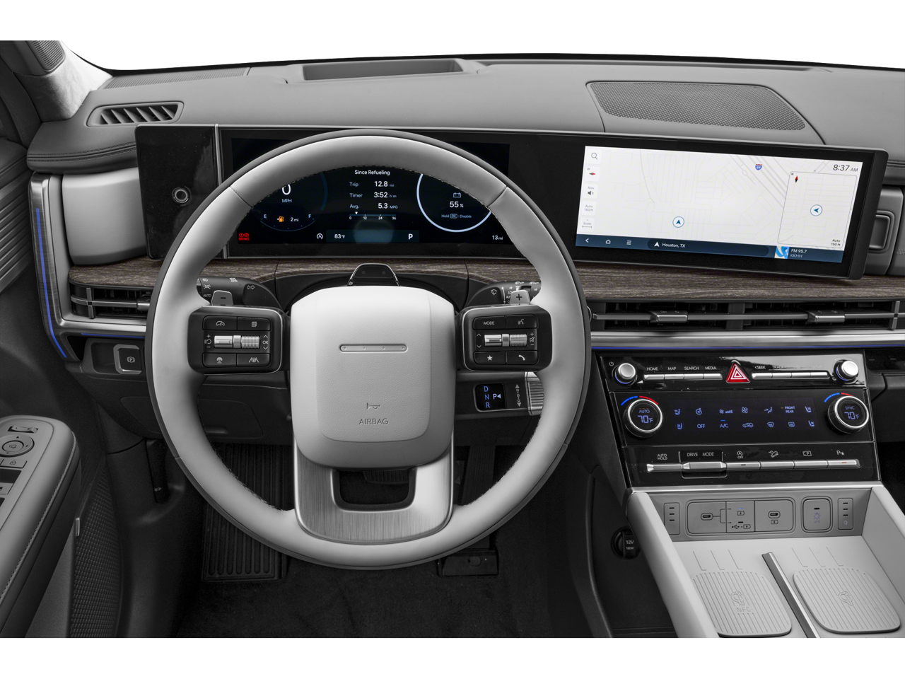 - Radio: AM/FM/HD Bose Premium Audio System -inc: 12 speakers including subwoofer, external amplifier, 12.3" wide touchscreen, Apple CarPlay and Android Auto, Bluetooth® hands-free w/wireless audio streaming, dynamic voice recognition, USB connectivity, SiriusXM, Blue Link+ connected car system, over-the-air updating capability, navigation system including traffic flow w/incident data via HD Radio (HERE) and rear seat quiet mode